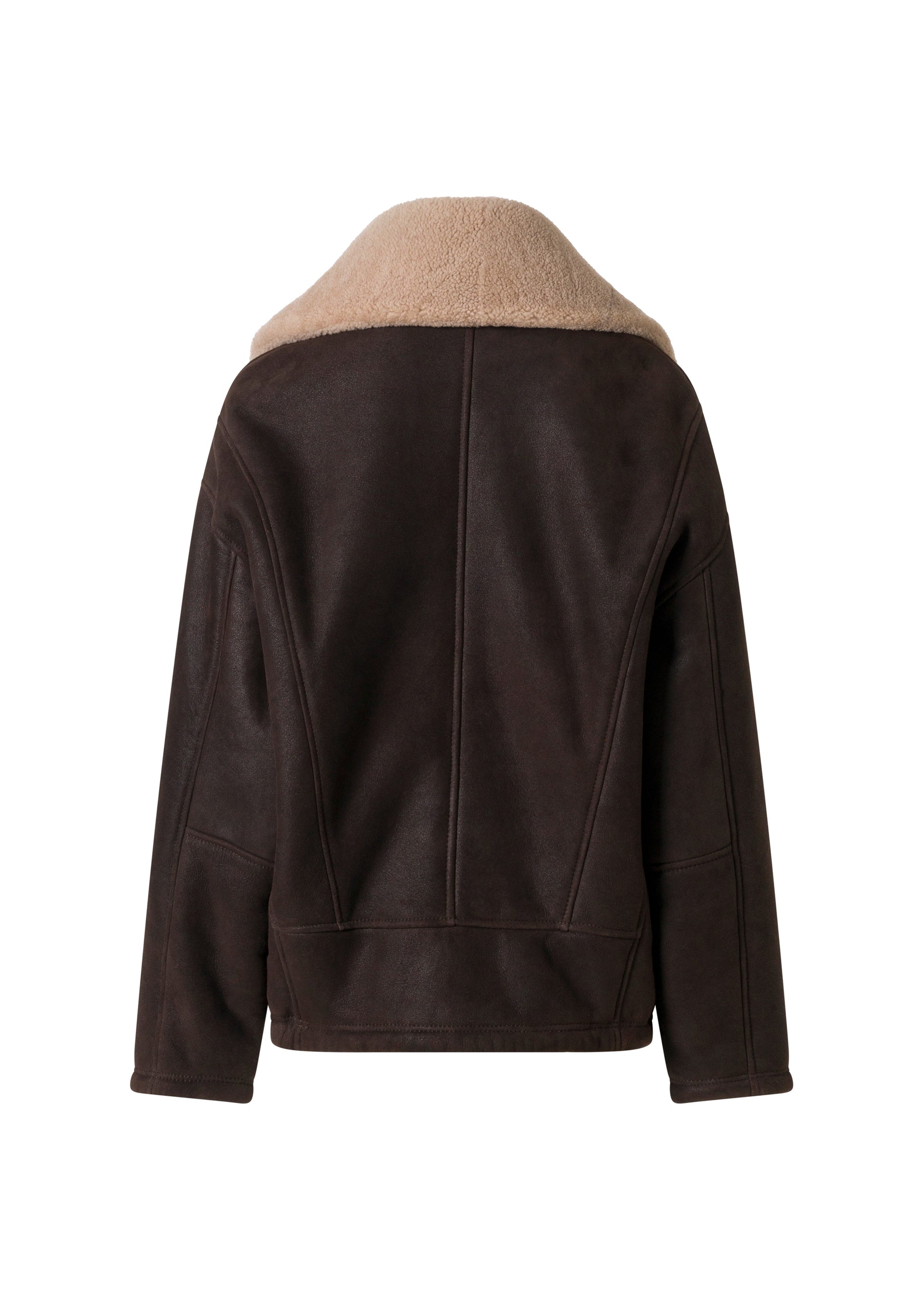 Jacket crafted from soft curly lamb shearling in a rich espresso tone, contrasted with a beige inner fleece and an oversized shawl collar.