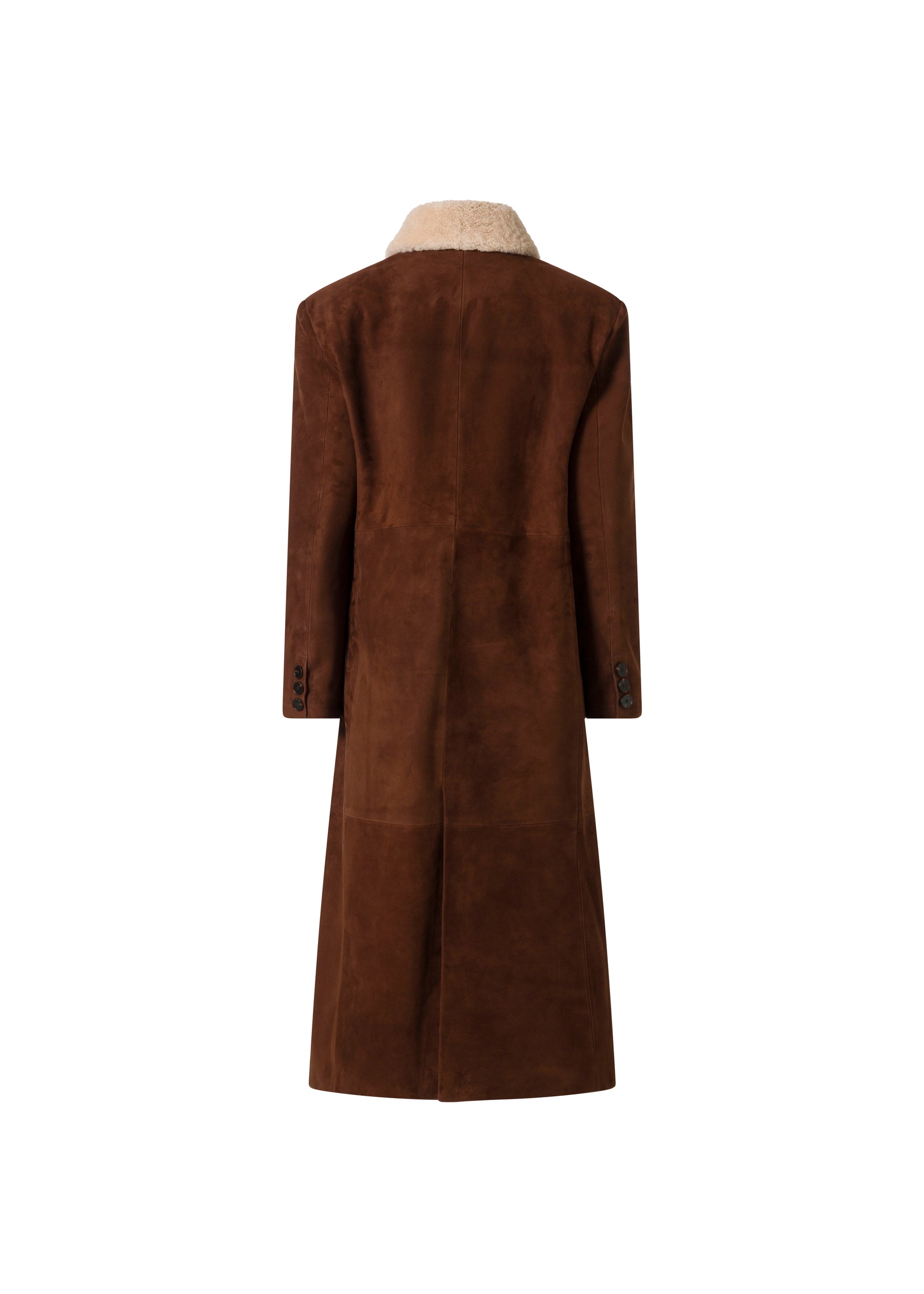 Single-breasted coat crafted from soft suede cow leather, featuring a center front button closure and front patch pockets.