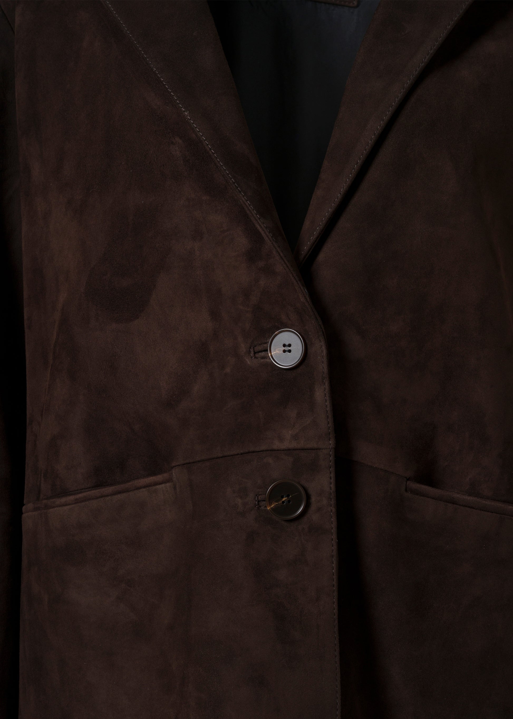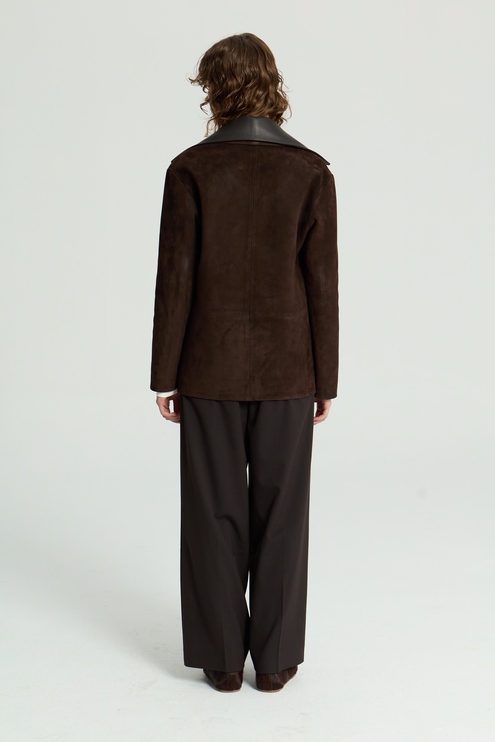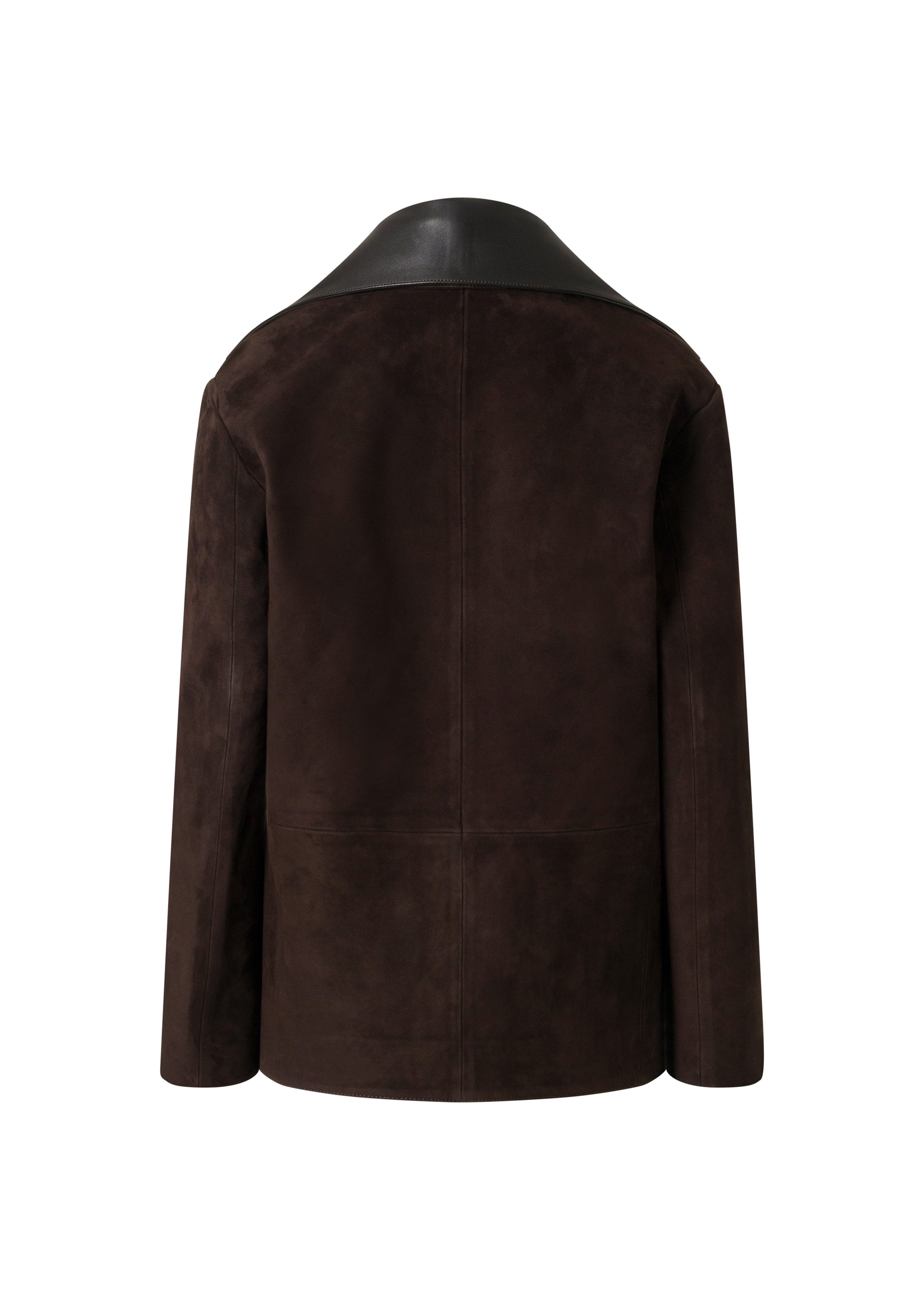 Tailored from smooth dark brown suede lamb leather, the Noir Collar Blazer reimagines classic tailoring through contrasting textures.