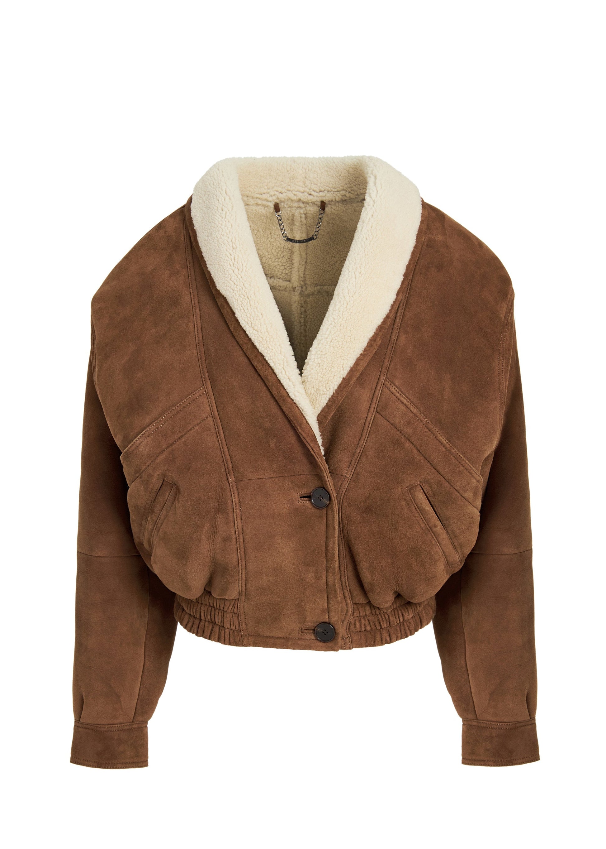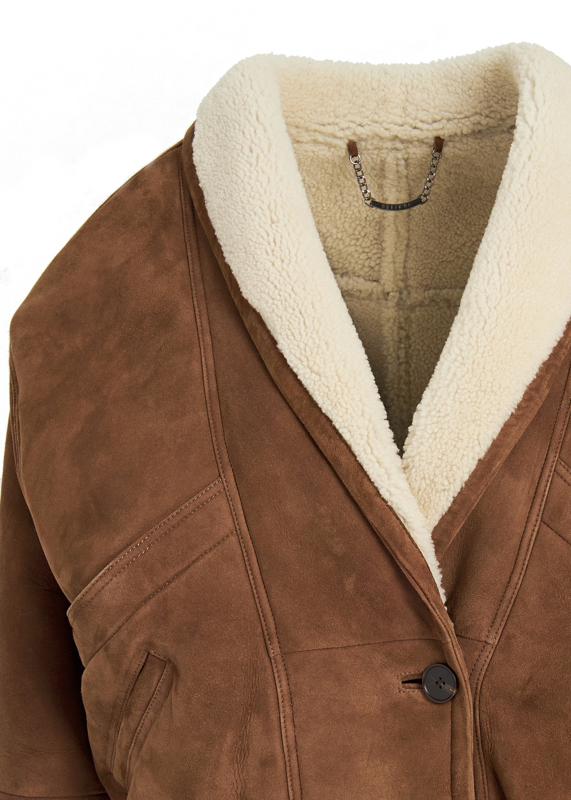 Cropped shearling jacket crafted from premium suede leather in a rich caramel tone, fully lined with soft natural shearling for warmth and comfort. Designed with a relaxed silhouette and a wide shawl collar, the piece combines vintage-inspired character with modern proportions. Sculptural paneling and a softly gathered hem create a flattering shape while maintaining a strong, effortless presence.