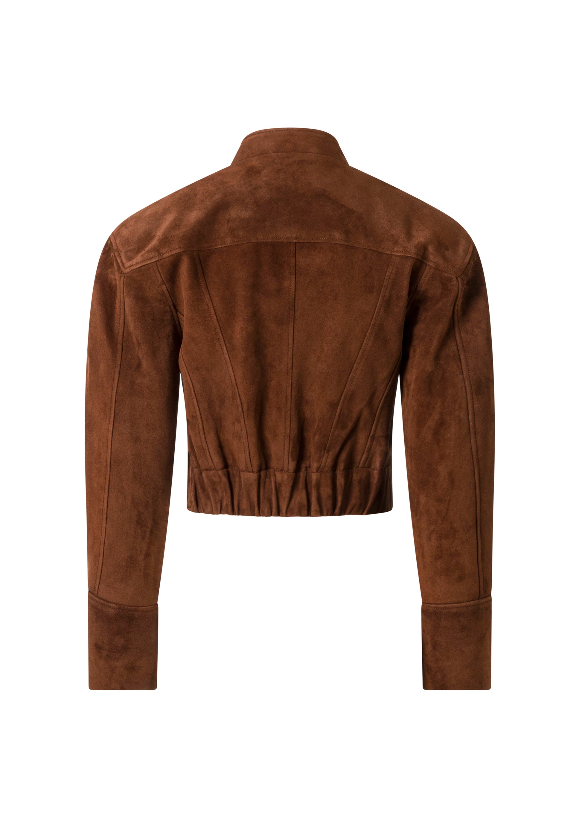 Cropped jacket crafted from smooth suede lamb leather in deep terra brown, featuring a structured high collar and concealed front closure.